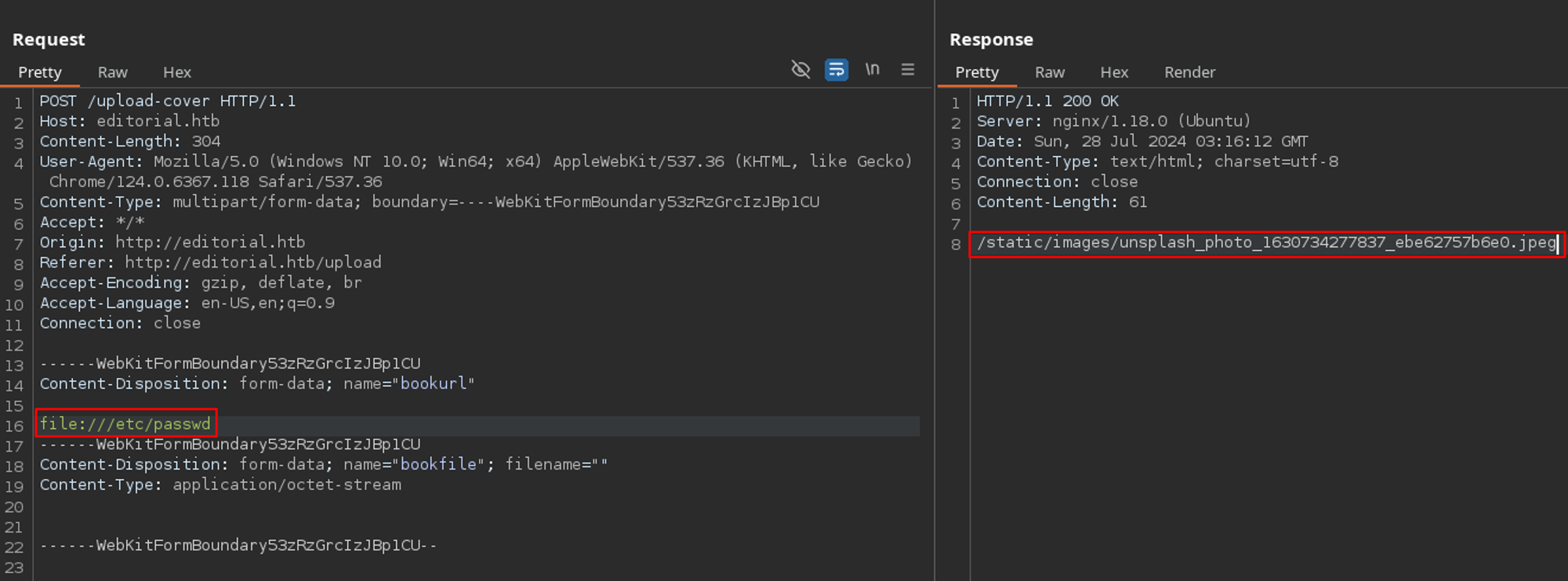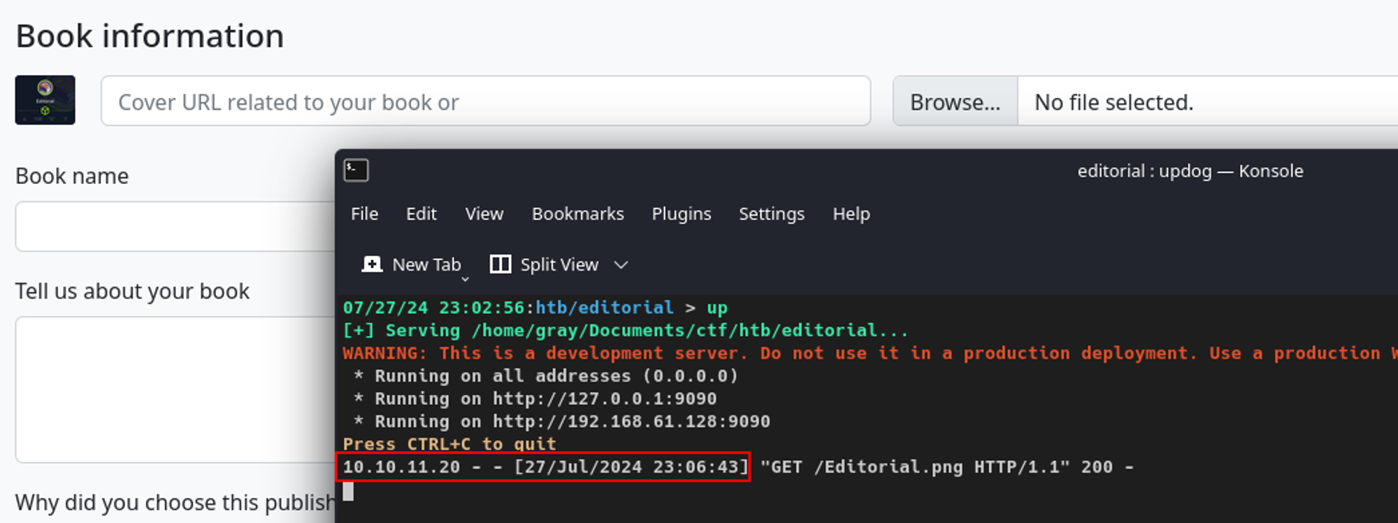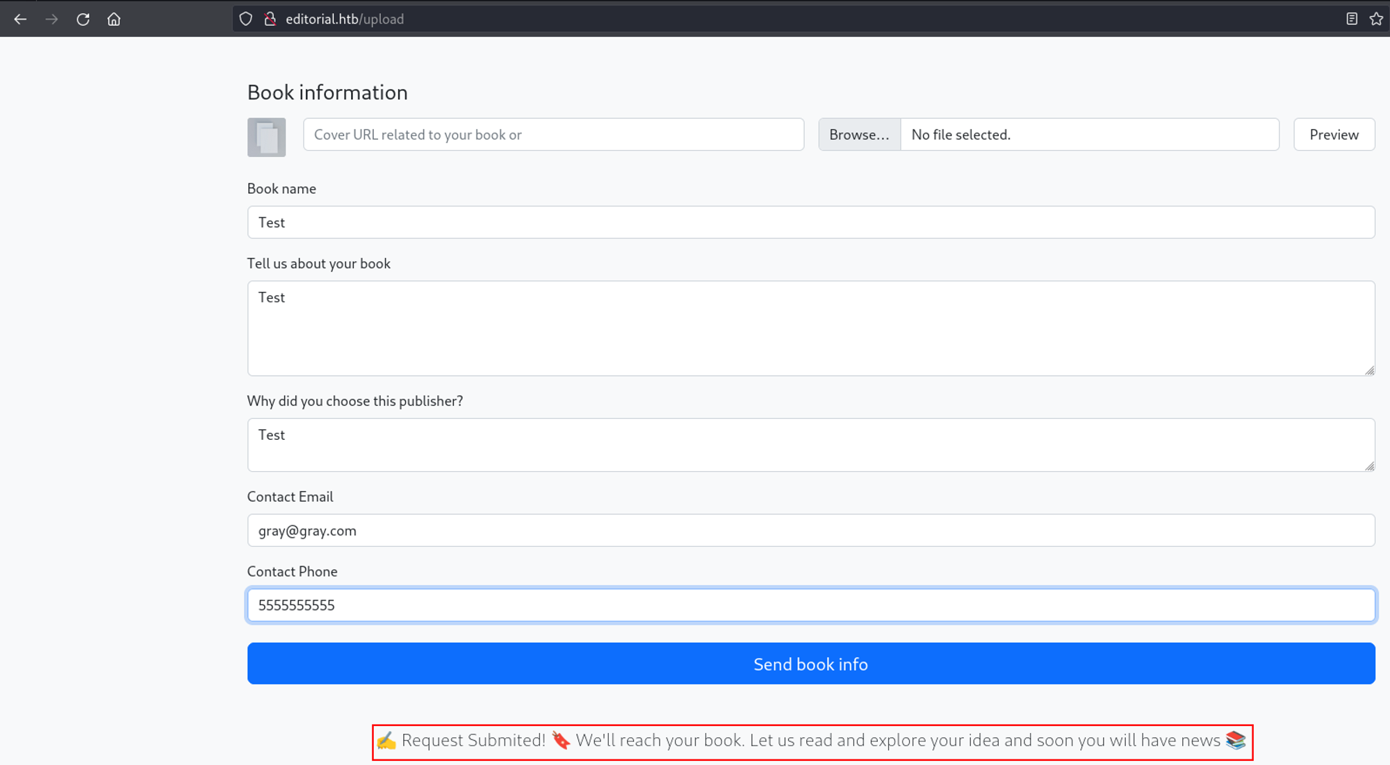 Part of the submission process was to upload the cover of the book via two methods: the URL of the image or uploading it directly through the page. I first uploaded an example image through the page and noticed the cover preview changed and was uploaded to hxxp://editorial.htb/static/uploads/96d17262-c390-4568-84f9-afbf4178aa74.