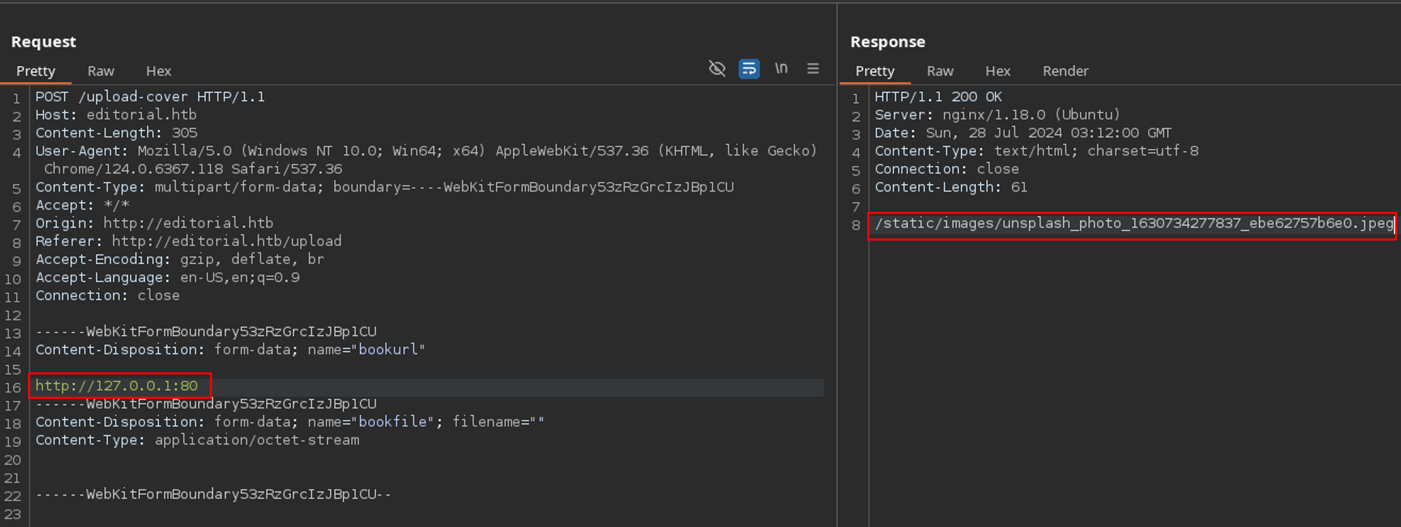The first thing I did was change my Kali IP in the request to 127.0.0.1 to see if the server would show reveal internal resources. Instead of something interesting, I got the same generic cover image location.