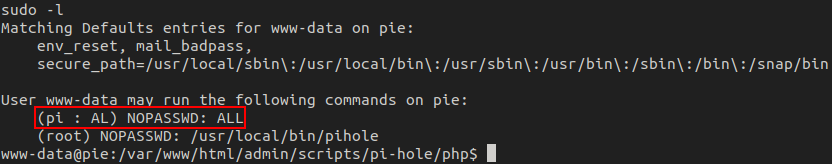 This time, www-data can run a few things with sudo. The one that sticks out is being able to run any command with sudo as the pi user.