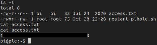 The script located at /home/pi/restart-pihole.sh is being run by root every minute. Since this script is located in our home directory, we can just modify it.