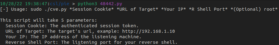 There are a number of parameters that are required for this exploit to work which include the cookie, target URL, attacker IP, and listening port.