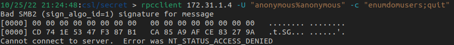 However, in this case, we aren't so fortunate. When binding using rpcclient, we get access denied. Bummer...it was worth a shot.