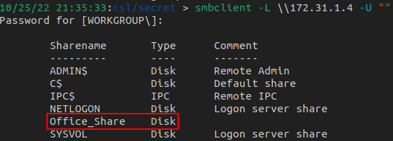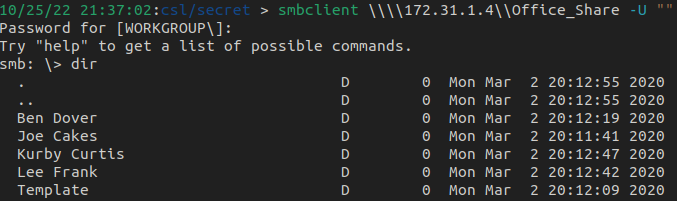 Using smbclient, we connect anonymously and find an intriguing share called Office_Share