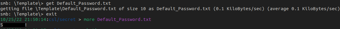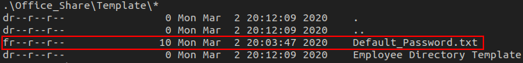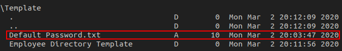After enabling recursive listing, we find a file named Default_Password.txt in the Template directory.