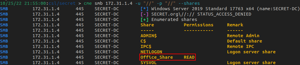 Using crackmapexec to list shares and see that we have read access to the Office_Share share