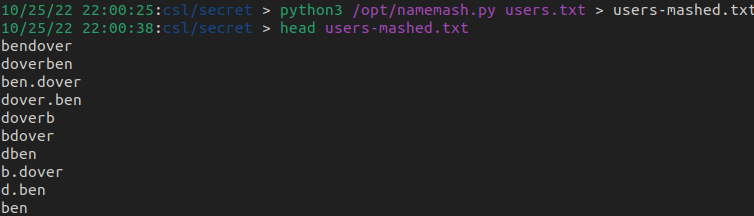 Lee FrankI used namemash to generate a word list of permutations of the names we found which should cover possible AD username schemas.