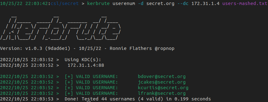 We have a list of possible username formats, but we don't know which format is being used in the domain. I used kerbrute to go through the word list to find valid users in the domain.