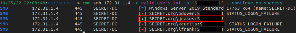 Now that we have what appears to be a default password (remember, we found that via SMB enumeration) along with a list of valid users, I used crackmapexec to spray the password to see if any user was using that password.