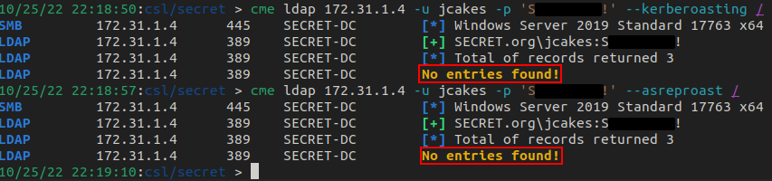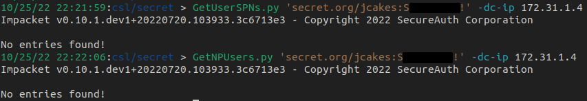 Great, we have credentials, now what? Well, since we have credentials, are there any service accounts that we can kerberoast? What about potential ASREP roasting? We can use crackmapexec or Impacket to do these checks. In our case, there are no accounts to roast.