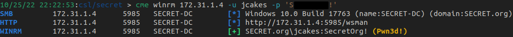 Using the winrm protocol in crackmapexec, we can see if jcakes can get a shell via Windows Remote Management. In this case, we can.