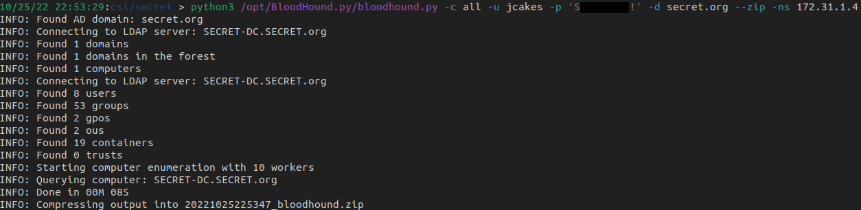 python3 /opt/BloodHound.py/bloodhound.py -c all -u jcakes -p 'Sxxxxxxxx!' -d secret.org --zip -ns 172.31.1.4