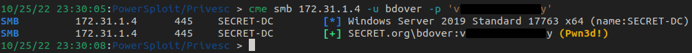 Since bdover is required for our attack path, let's check to see if the password we just found works for the account. This can be done using crackmapexec.