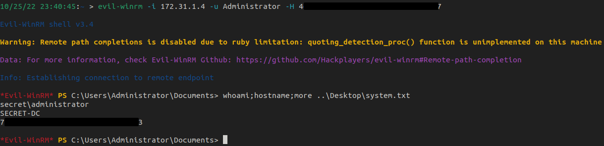 With the administrator hash, we can use Evil-WinRM again to get a privileged shell on the box -