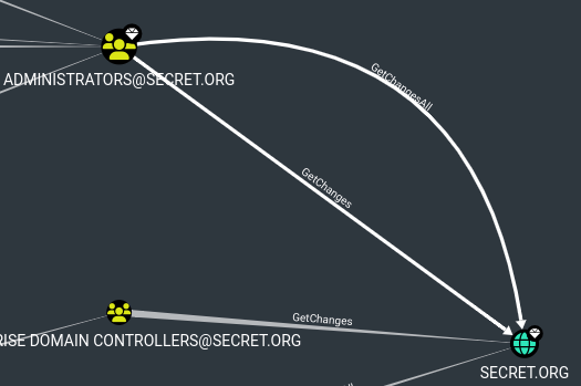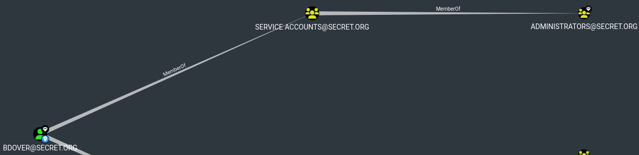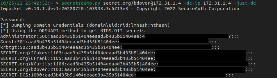 However, since bdover is technically in the administrator's group (nested groups), he has replication privileges over the secret.org domain object. We can simply do a DCSync attack to dump ntds.dit and own the entire domain.