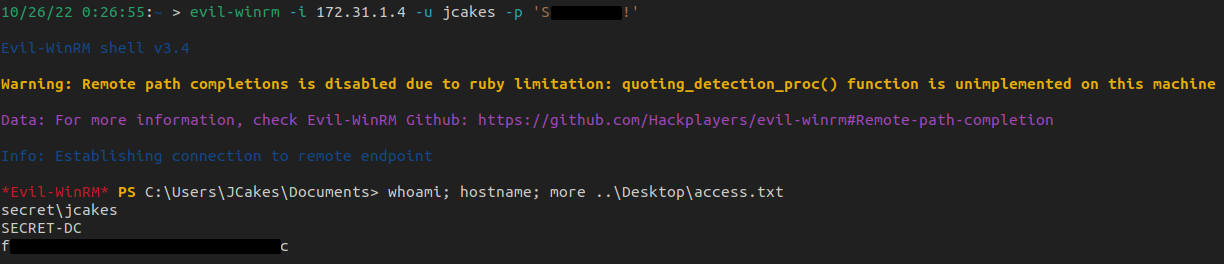 As jcakes can use WinRM, we utilize Evil-WinRM to get our initial shell on the box and get our user flag.