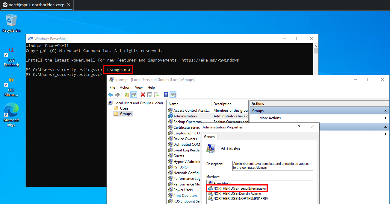 ```Re-connecting to NORTHJMP01 confirms the _securitytestingsvc was in fact added to the local administrators group.