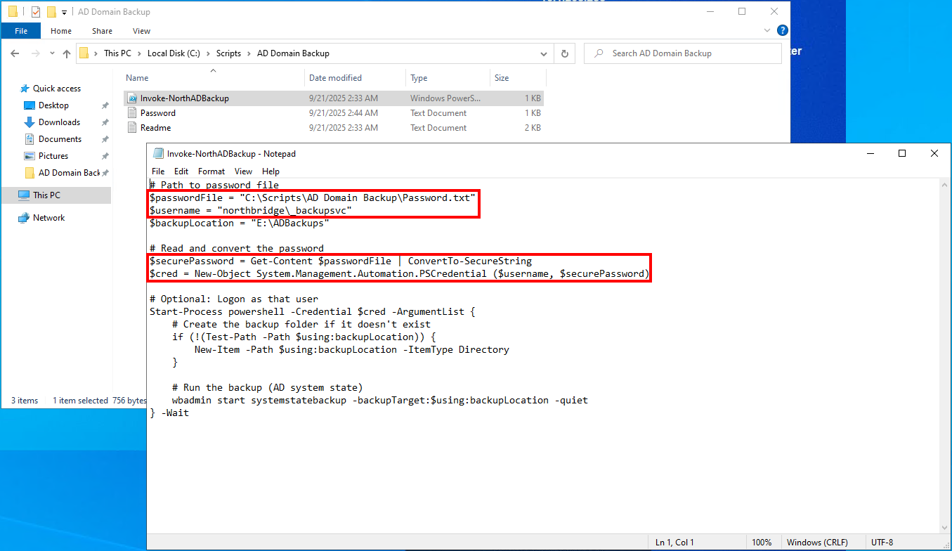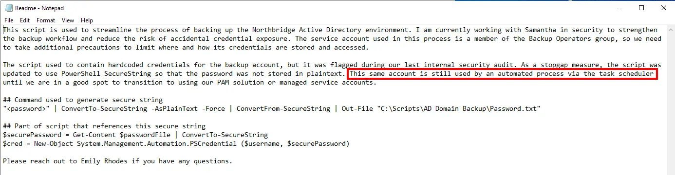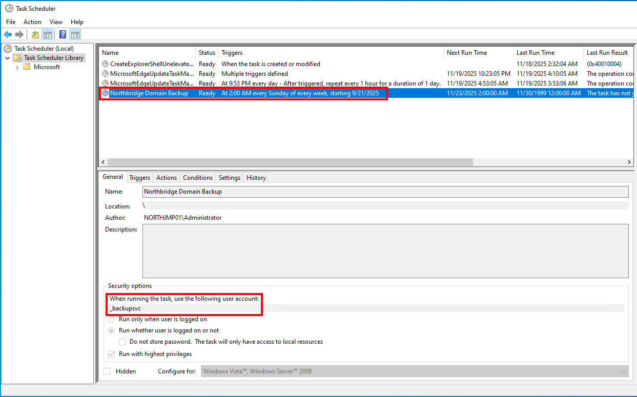 On NORTHJMP01, there is a task in the task scheduler called Northbridge Domain Backup and the task is being executed in the context of the _backupsvc domain account.