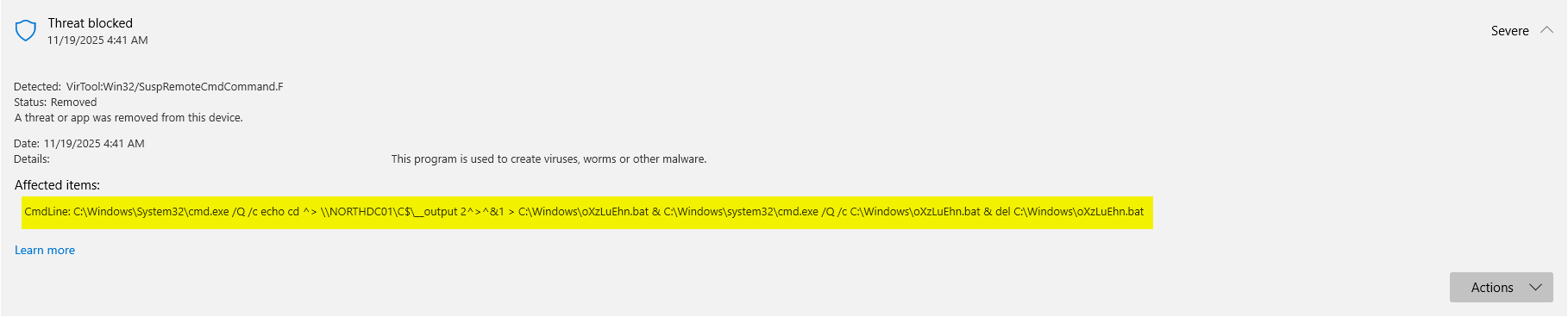 SMB northjmp01.northbridge.corp 445 NORTHJMP01 [+] Executed command via wmiexecIt looks like the command was picked up by Windows Defender! No worries, we can re-run the previous command, but this time, including --no-output. This allows the command to run and modify the local administrators group.