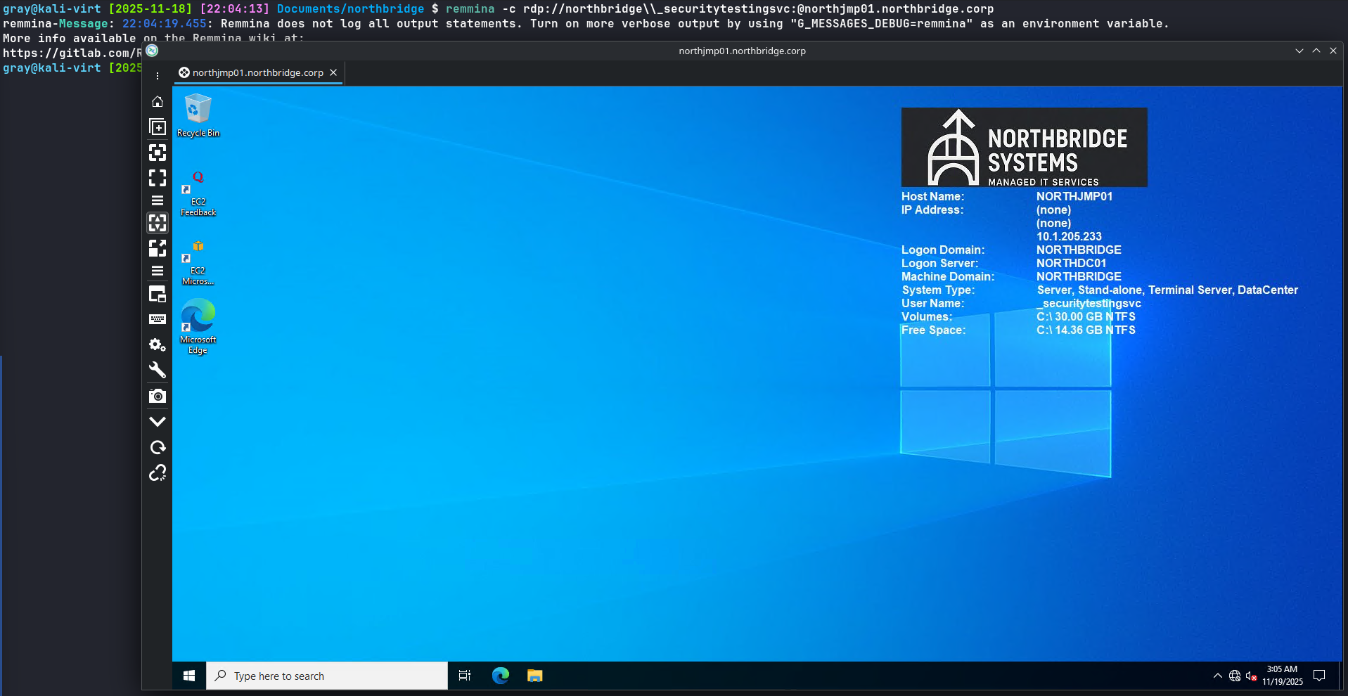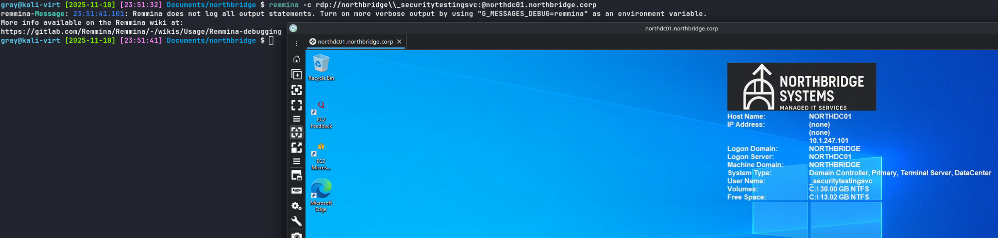gray@kali-virt [2025-11-18] [23:51:32] Documents/northbridge $ remmina -c rdp://northbridge\\_securitytestingsvc:@northdc01.northbridge.corp