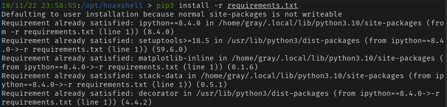 We need to use pip to install the requirements to ensure hoaxshell has all of the dependencies installed to run. In my case, this has already been done, but if you're following along, it might be different for you.