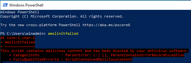 Just to confirm, all of the defenses are running on the Windows VM, we can run something like amsiinitfailed to verify AMSI is doing its thing. As expected, AMSI stepped in.