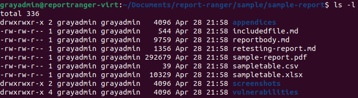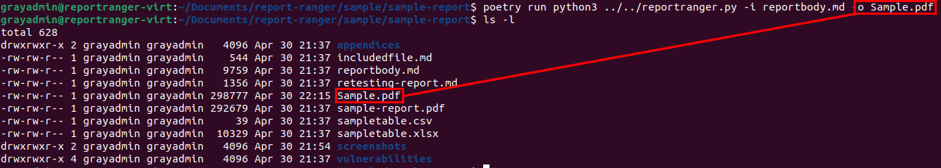 Once you have everything set up, you just need to use Poetry to run reportranger.py from the root Report Ranger directory. For simplicity, I will execute this from within the "sample-report" directory. I normally do this as I want to keep my final PDF with the rest of the files that made up the report.