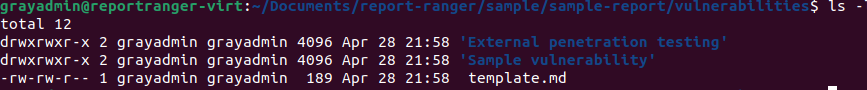 - vulnerabilities - This will house your individual findings each with their own markdown file. This directory is referenced directly in the report. All you need to do is create a new markdown file for each finding and Report Ranger will do the rest.