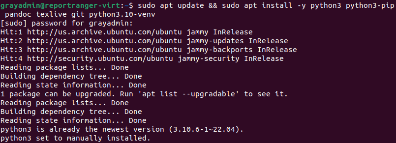 sudo apt update && sudo apt install -y python3 python3-pip pandoc texlive git python3.10-venv