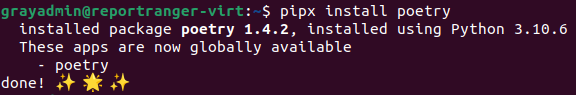 Report Ranger uses Poetry to specify which packages (and their versions) to use inside the virtual environment. To use Poetry, we need to install it using pipx. This is a simple installation process, similar to pipenv, and can be done with the following command: