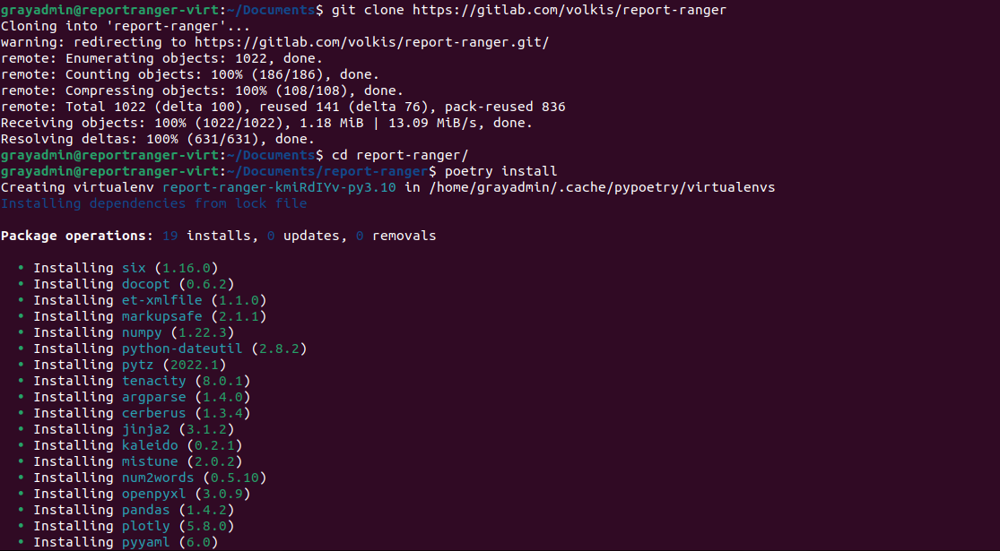 Once we have all the dependencies set up, it's time to install Report Ranger. To begin, let's clone the repository, and then use Poetry to install all the necessary Python dependencies within a virtual environment. I personally choose to clone the repository in my Documents directory, but you can clone it wherever works best for you.