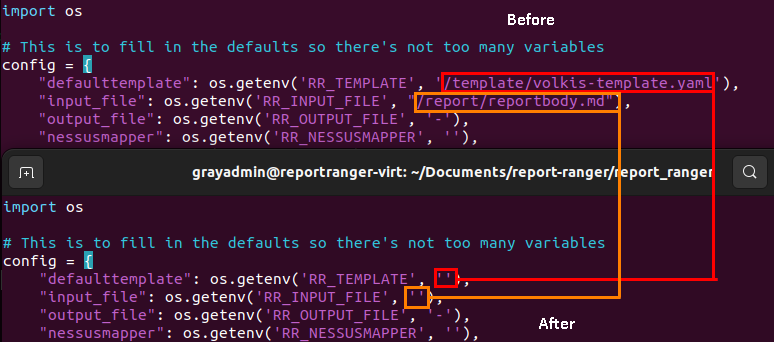 In the configuration file, we can remove the hard-coded paths for defaulttemplate and input_file. To do this, simply delete everything between the single quotes. Once you become more familiar with Report Ranger and how it works, feel free to set these again. But for now, we don't really need them, as they can be specified at runtime.