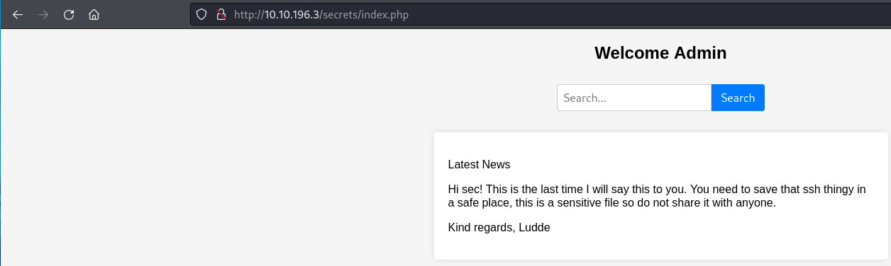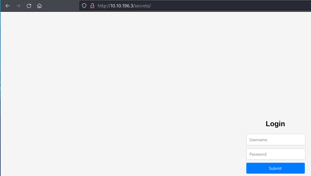 secrets [Status: 301, Size: 316, Words: 20, Lines: 10, Duration: 321ms]Going to http://10.10.196.3/secrets/ returned a login page.