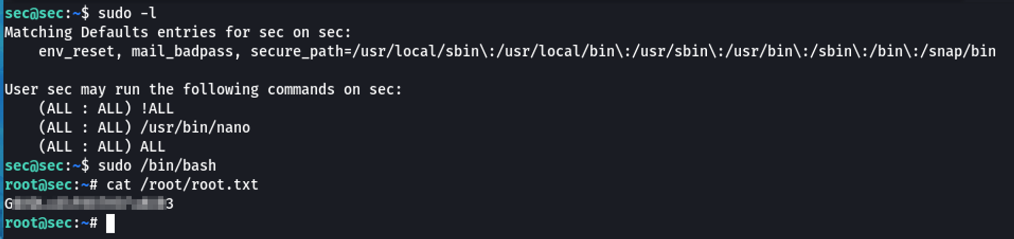 Would you look at that, the sec user can run anything with sudo privileges.