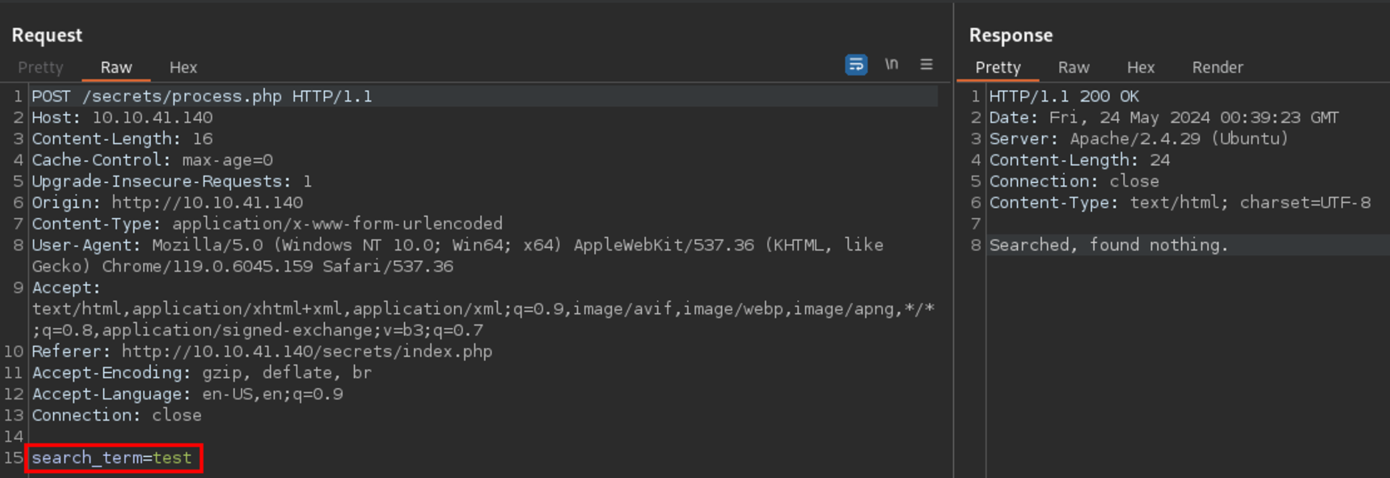 Okay - so we have a search feature that does not appear to do much. Let's proxy this through Burp to see what it looks like.