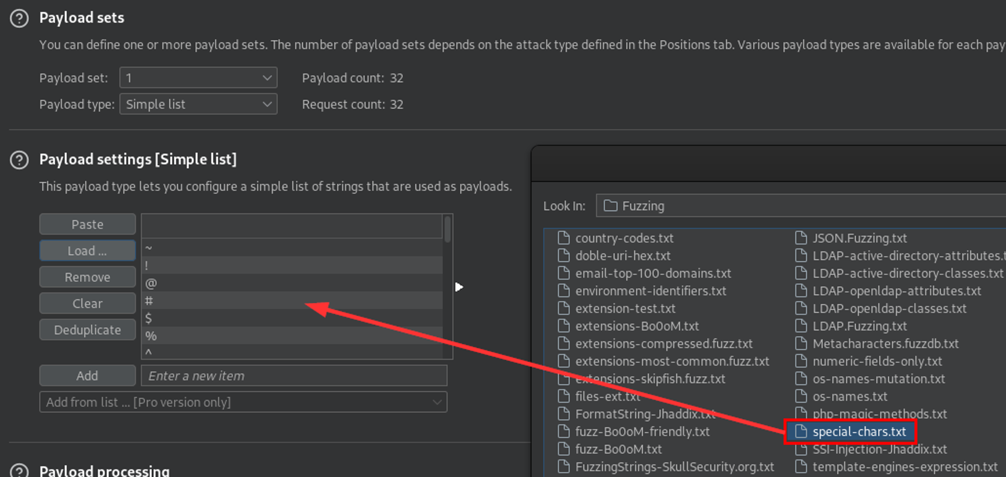 I used the special-chars.txt wordlist from SecLists - /usr/share/wordlists/seclists/Fuzzing/special-chars.txt